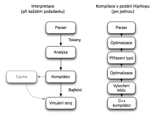 Běžné zpracování PHP skriptů prochází přes několik vrstev. Nejprve se projde zdrojový kód, které se převede do jednotlivých jazykových elementů, tzv. tokenů. Z nich kompilátor vygeneruje bajtkód, tedy kód obsahující instrukce virtuálního stroje. Ten je zpracovává a převádí na instrukce procesoru, které se přímo vykonávají. Tento postup se nazývá interpretace a provádí se pro každý požadavek a každý vložený soubor.