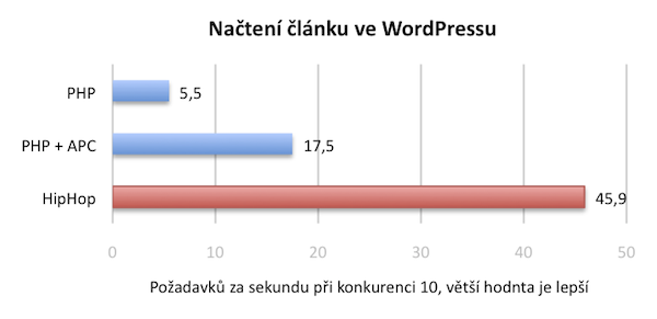 Graf ukazuje, kolik server zvládl zobrazit stránek za sekundu, když se na něj zároveň posílalo 10 požadavků. Více než trojnásobné zrychlení přineslo použití cache bajtkódu, použití HipHopu dokonce více než osminásobné, resp. trojnásobné oproti verzi s cache.
